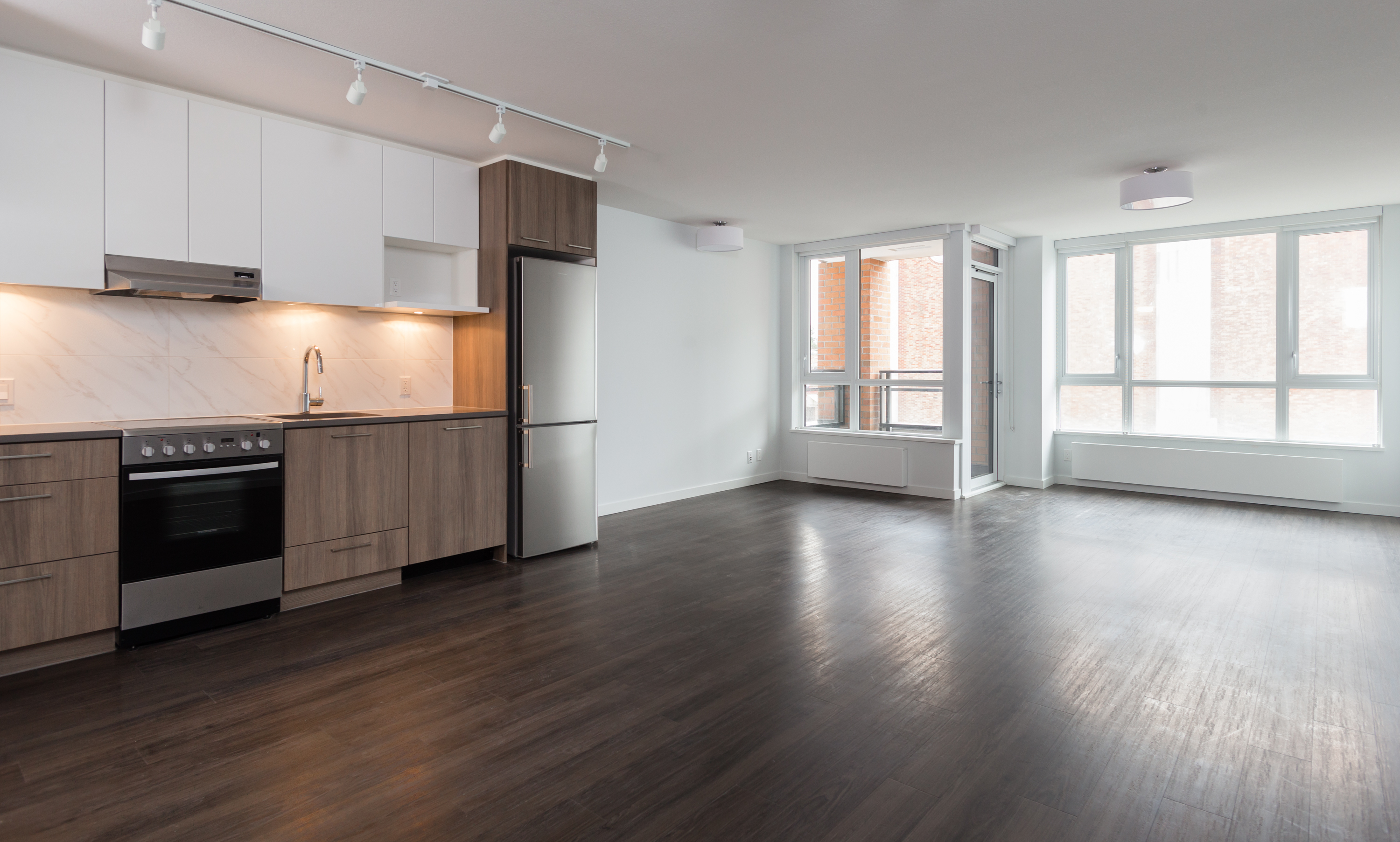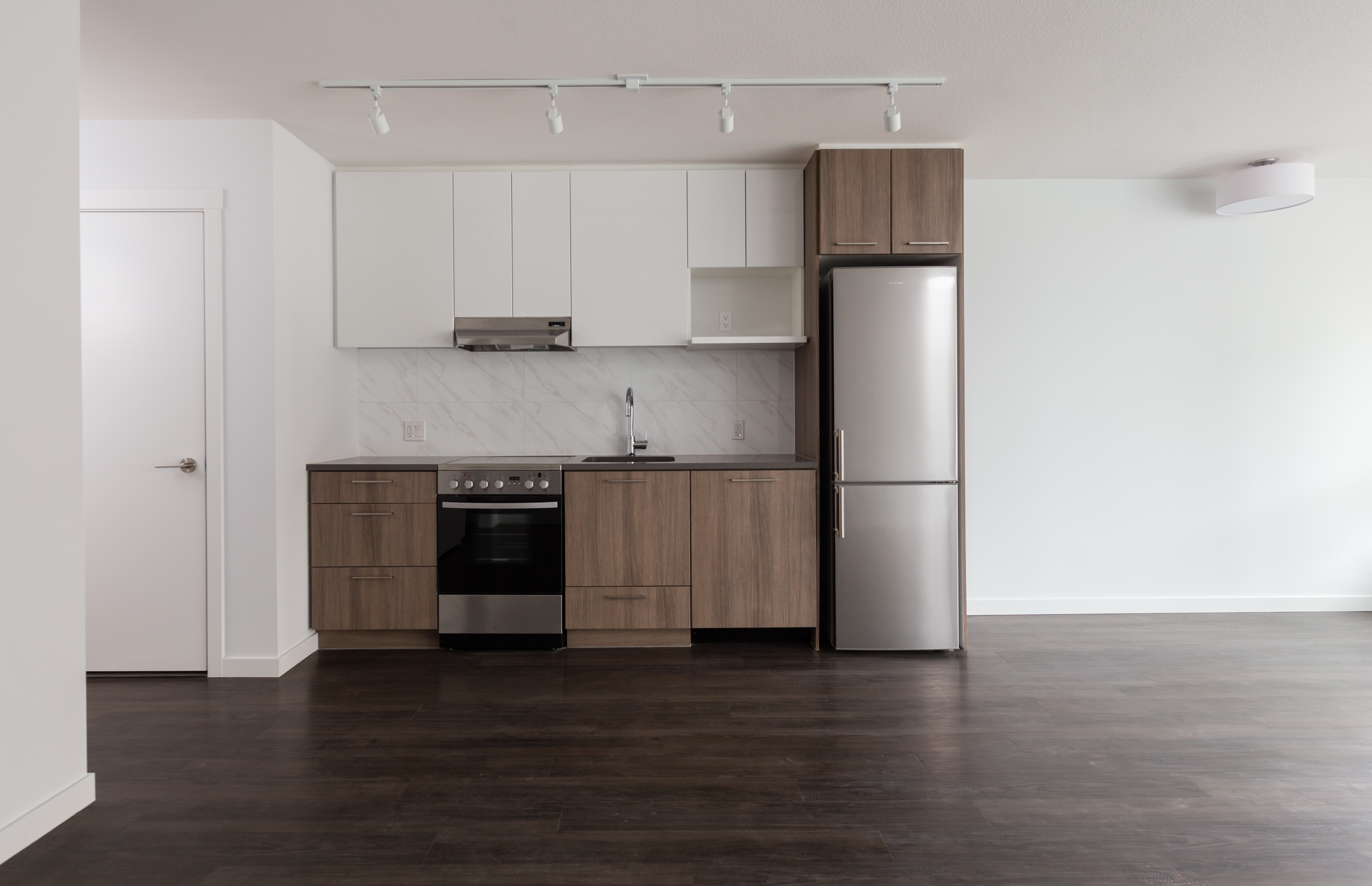 At 670 square feet, the B8 is the largest of our junior 1BR suites. This suite allows for maximum flexibility with a separate office or flex space, and transforming walls that move to fit your needs. The suite features modern finishes including: stone countertops, vinyl plank floors and a full appliance package. Facing south, relax on your balcony and check out the scene below.