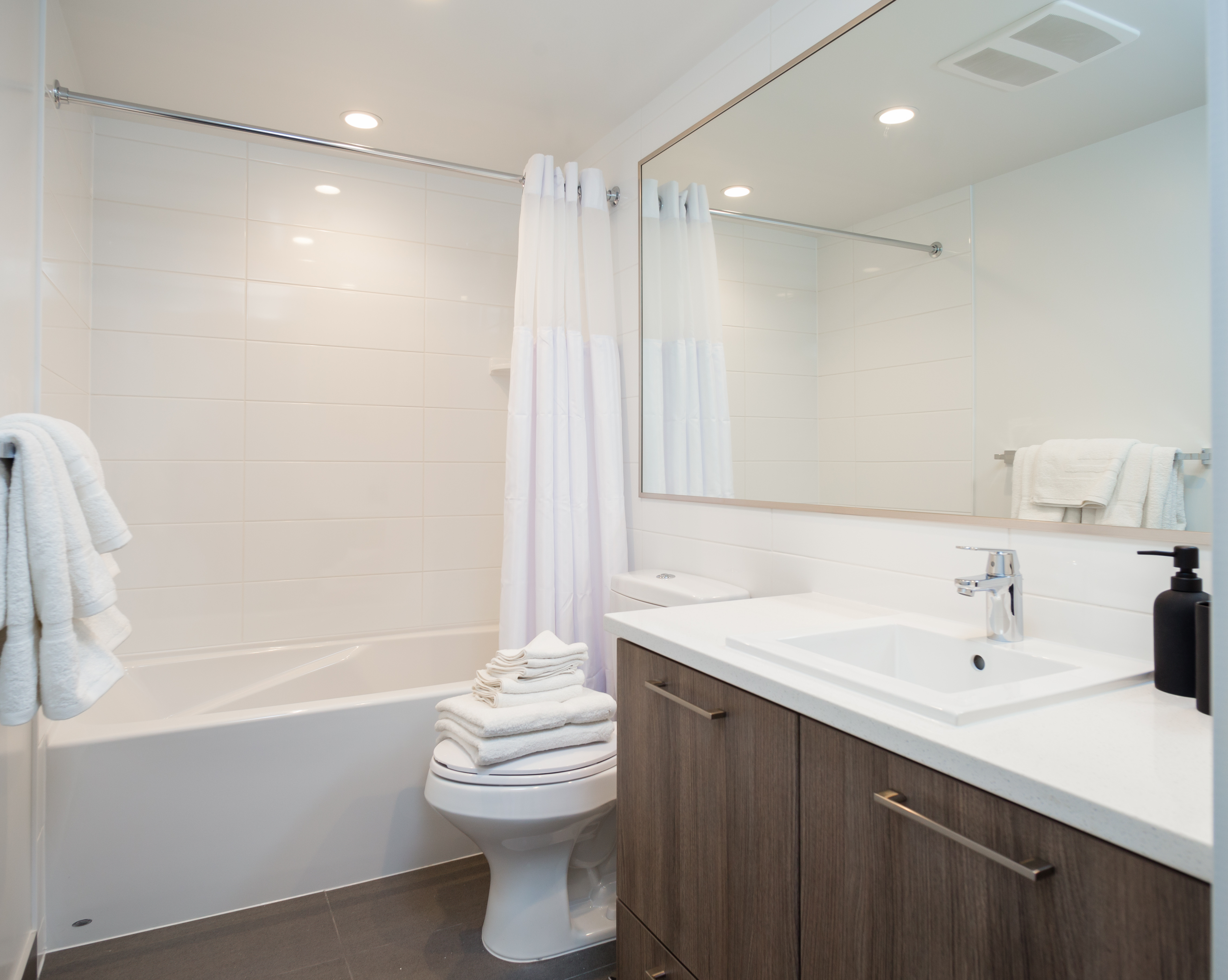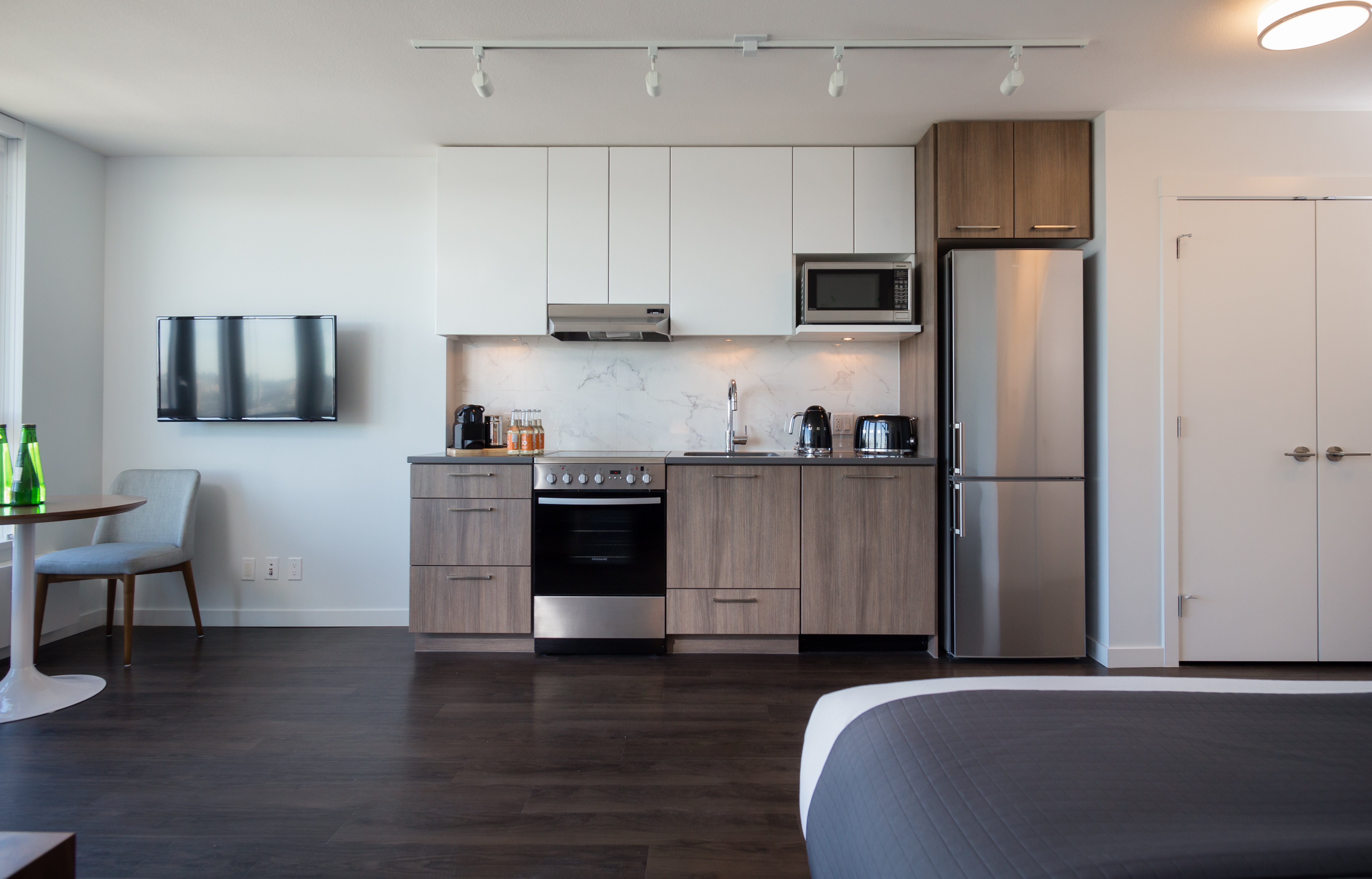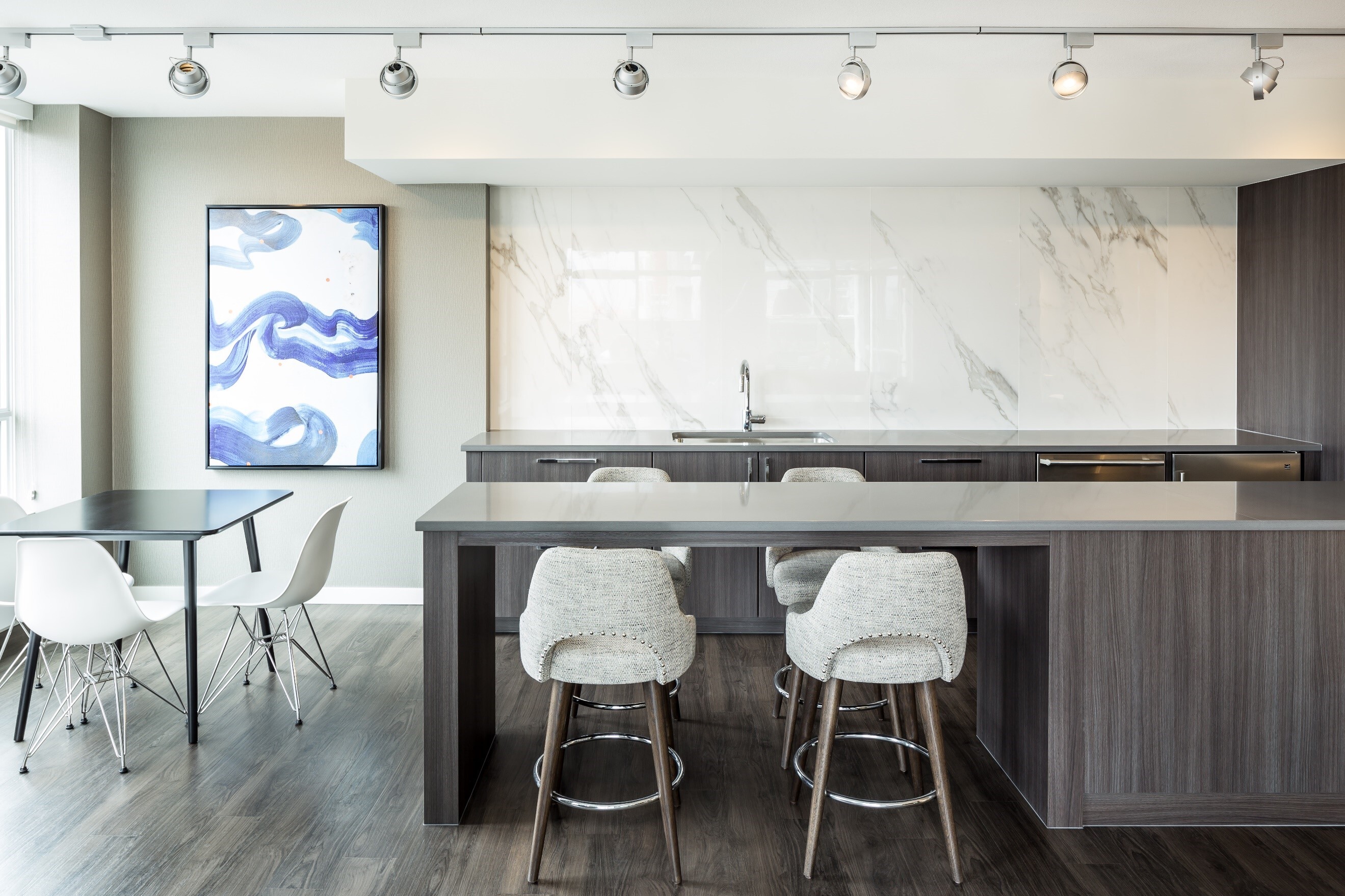 Our A3 studio plan is the largest of our studio suites, it also includes a separate office or flex space. The suite features modern finishes including: stone countertops, vinyl plank floors and a full appliance package. Relax on the west-facing balcony and take in the amazing views of Downtown Vancouver, the mountains, and ocean.