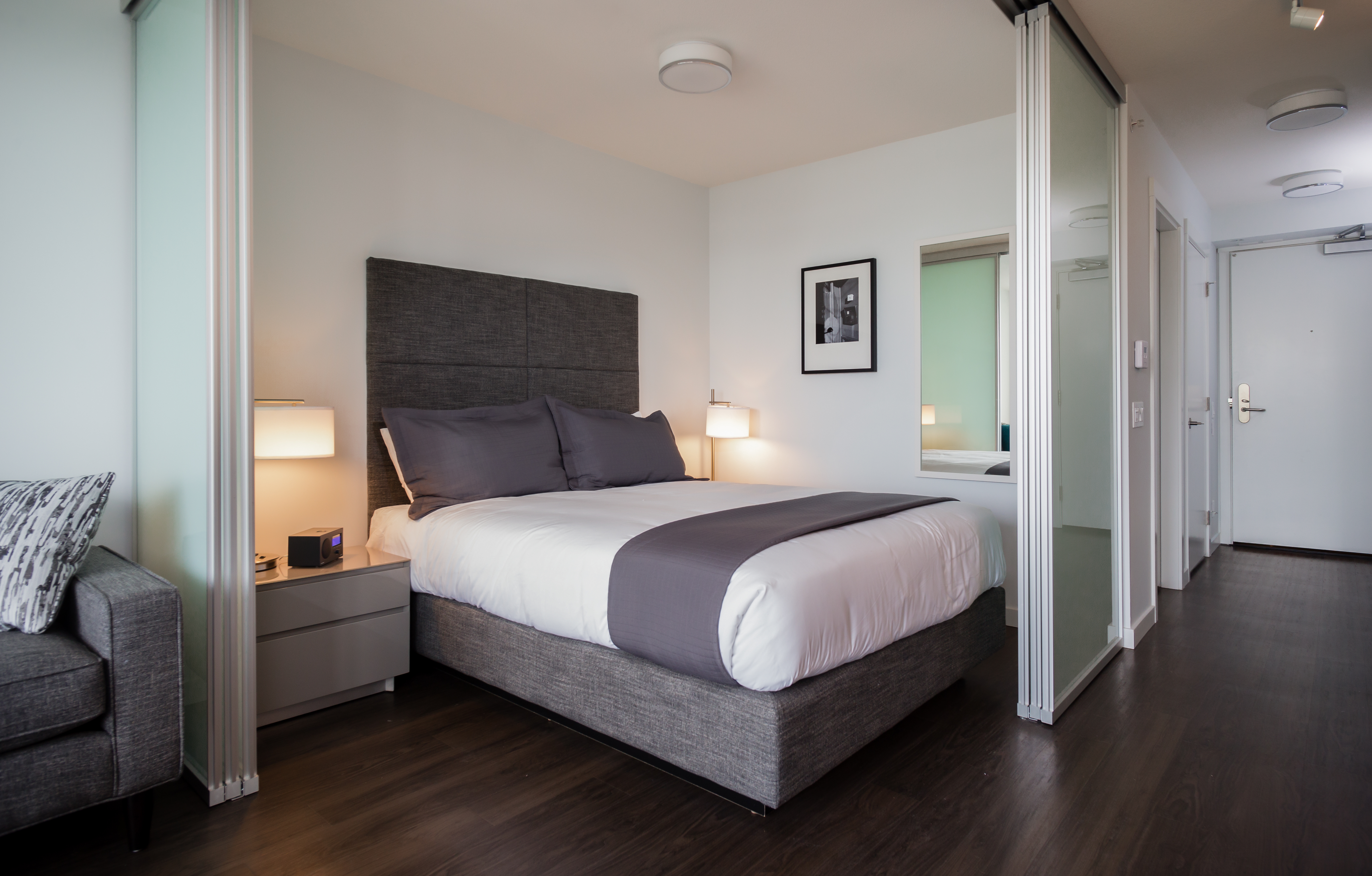This junior 1BR and flex suite allows maximum flexibility with its separate office and transforming bedroom walls. The suite features modern finishes including: stone countertops, vinyl plank floors and a full appliance package. Relax on the west-facing balcony and take in the unbeatable views of Downtown Vancouver, the mountains, and the ocean.